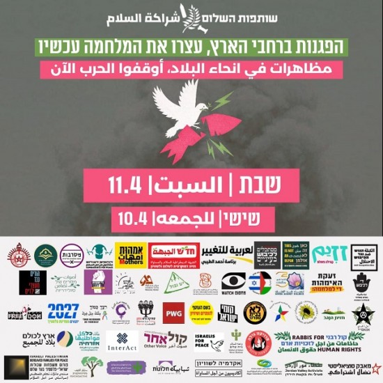 رغم الإعلان عن وقف إطلاق النار مع إيران، ستُقام ما لا يقل عن 11 مظاهرة خلال عطلة نهاية الأسبوع المقبلة (الجمعة–السبت، 10–11 أبريل) في مختلف أنحاء البلاد، احتجاجًا على استمرار القتال في لبنان وعلى ما يصفه المنظمون بمحاولات الحكومة الإسرائيلية تقويض وقف إطلاق النار مع إيران. ويشارك في تنظيم هذه الفعاليات ائتلاف "شراكة السلام" إلى جانب منظمات أخرى.