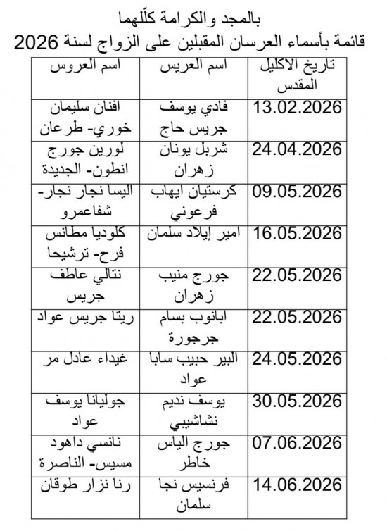لائحة بأسماء العرسان للأكاليل المقدسة لسنة 2026