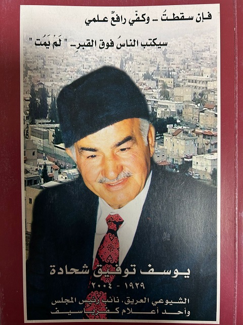 (إلى الرّفيقِ الّذي ثبّتَ بقاءَهُ في النّفوسِ الكريمةِ كالإباءِ والشّهامةِ والشّمَمِ، والقائدِ الّذي كلّما غابَ زادَ حضورًا، والإنسانِ الّذي خاطَبَ النّاسَ بلغةِ النّاسِ مُضيفًا إلى وعيِهِم ومفاهيمِهِم الفَهْمَ الكثيرَ، الباقي فينا: يوسف توفيق شحادة، أبو شحادة)