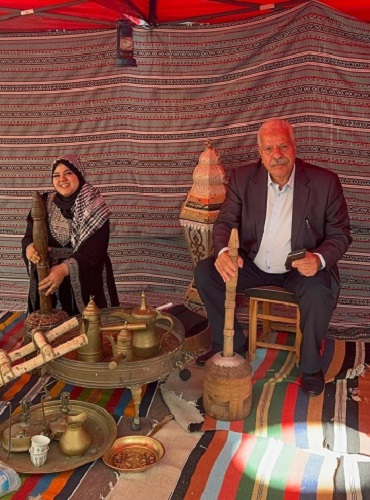 وفي محطّة أخرى عرضت تحت الخيمة الفلسطينيّة "المضافة" وفراشها المزركش بألوان النّسيج والتّطريز الفلسطينيّ والأدوات التّراثيّة من مستلزمات صنع القهوة وأدواتها، وأبرزها المهباج الّذي كان يستخدم لصنع القهوة "السّادة" والأباريق النّحاسيّة والفناجين المزيّنة بالتّصاوير المختلفة الألوان. كما ازدانت المدرسة بطلّابها ومعلّميها الّذين تزيّنوا بارتداء الأزياء الفلسطينيّة الفلّاحيّة والقرويّة، وبخاصّة باعتمار الكوفيّات الوطنيّة المتعدّدة الألوان، لقد جعل كلّ ذلك المشهد البهيج ذلك اليوم يومًا فلسطينيًّا بامتياز وروعة منقطعة النّظير.