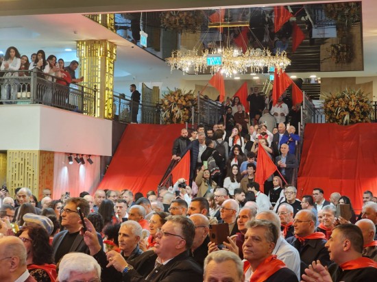 وعلى أنغام اوكسترا الشبيبة الشيوعية وتحت حشد من الاعلام الحمراء، انضم الحضور المهيب بالغناء والهتاف والتصفيق لنشيد بلادي. والتقت حناجر ترفع صوت الكرامة والوطنية والتحدي، من مختلف المواقع والبلدات والمدن، ومن مختلف الأعمار. وكان مشهدا افتتاحيا يشكل ترجمة اولية وقوية لشعار المؤتمر: نهضة فكرية وتنظيمية.