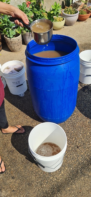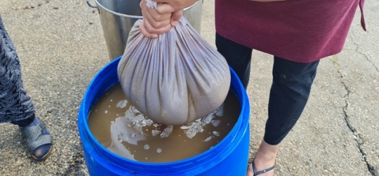 المرحلة الرابعة: يدعك الخروب بالماء (بالأيدي أو باستعمال آلة تساعد على الطحن)