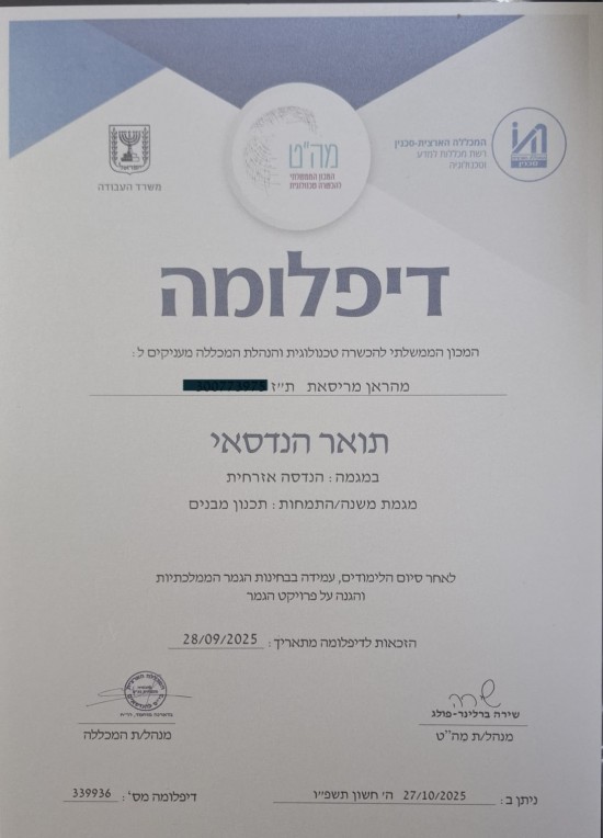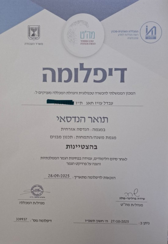 لحصوله على لقب הנדסאי בניין בהצטיינות