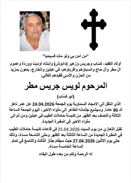 وذلك حتى يوم الاثنين 27.04.2026 حيث سيقام جنّاز الثالث والتاسع في تمام الساعة الخامسة مساءً.